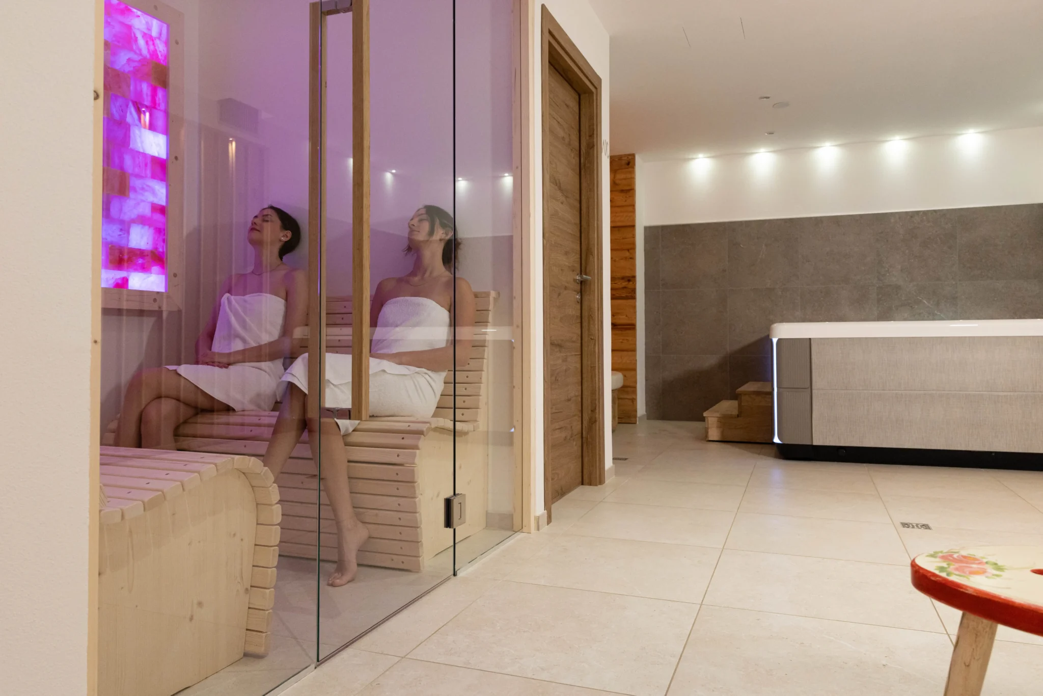 Un intimo rifugio, dove il profumo di cirmolo e i materiali naturali ti riportano al respiro delle Dolomiti. Prova la nostra spa in esclusiva!