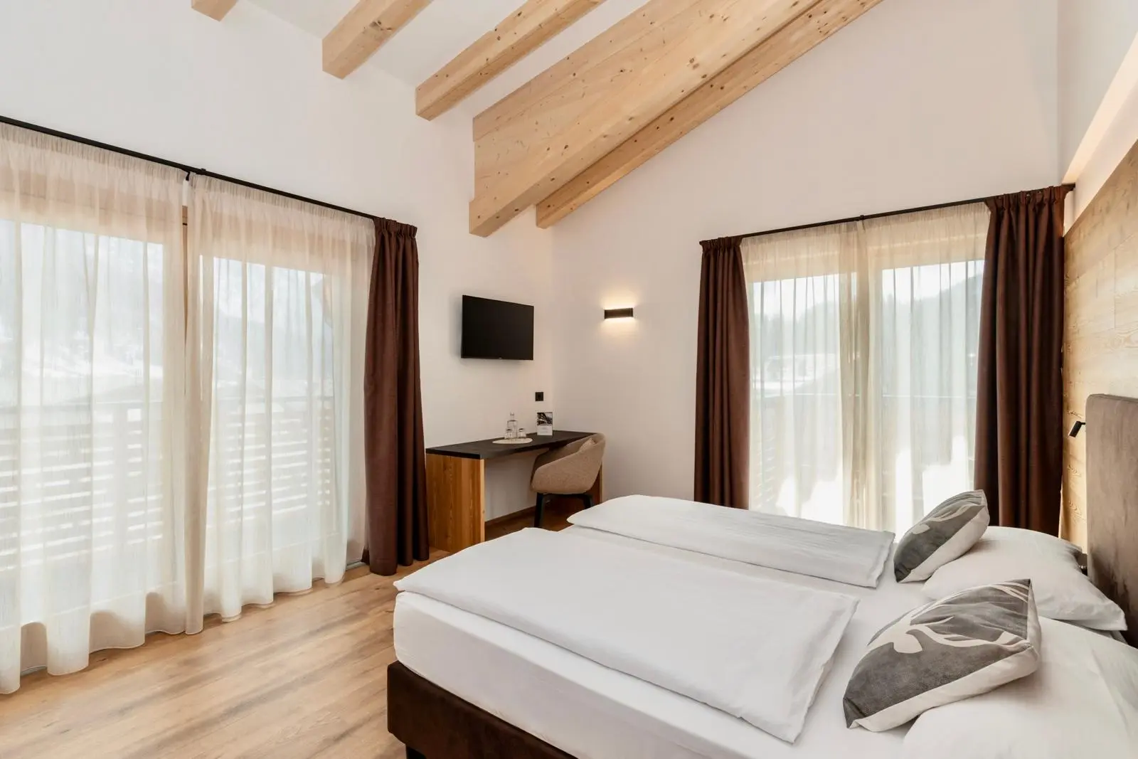 Legno naturale sotto i piedi, balcone, e lo sguardo che si apre sulle Pale di San Martino. Con il restyling 2026 arrivano nuove camere e spazi ancora più luminosi e contemporanei.