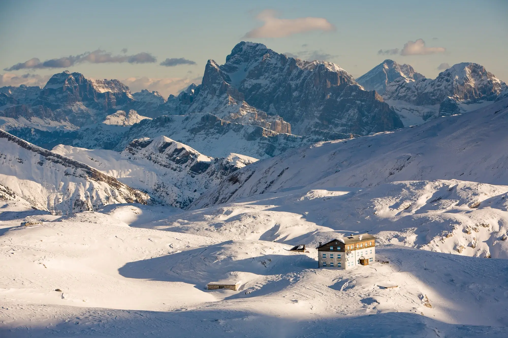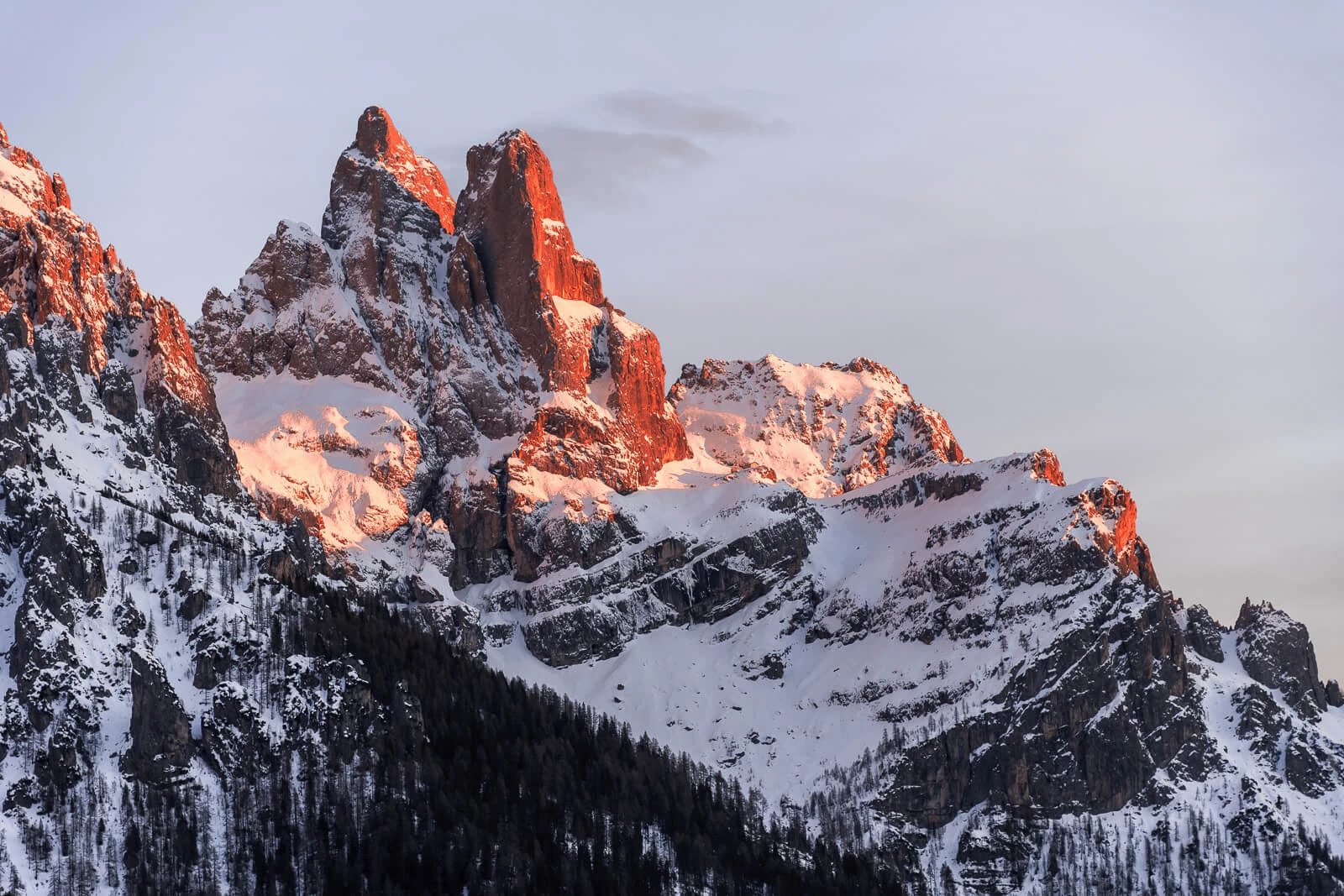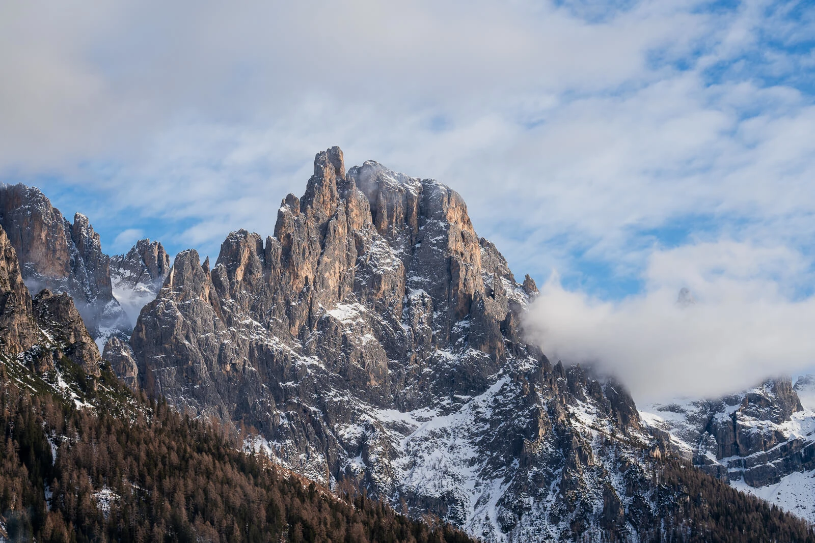 Snow-covered slopes await you, set against the backdrop of the majestic Pale di San Martino mountains.
